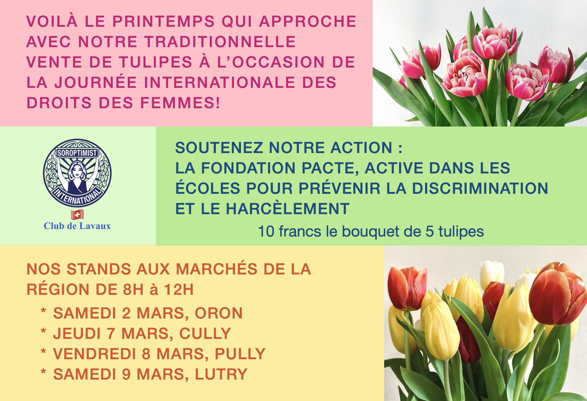 To raise funds, the Soroptimists of Lavaux have relied on their long-standing tulip sale project, which they have organized for over 20 years. The tulip sale took place at weekly markets in four different communities in the region, and the members mobilized extensively, leveraging their experience in preparation, order delivery, and market presence[1].