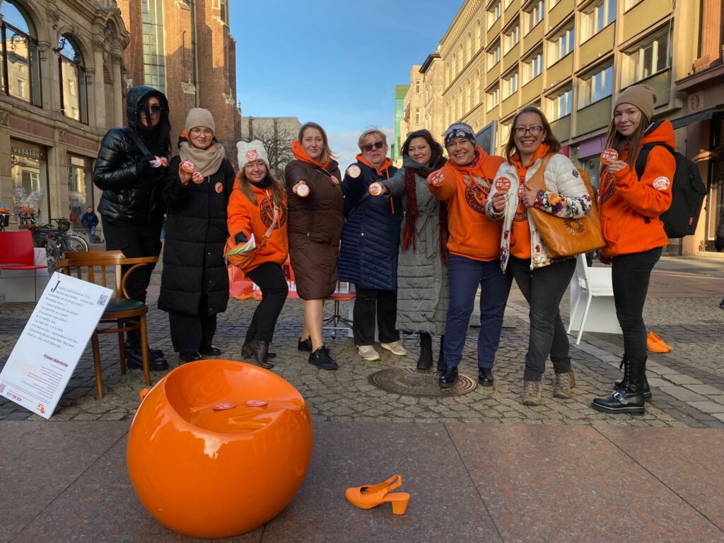3. Public Engagement in Wrocław – A street event invited the public to reflect on the reality of cyberviolence through recorded personal stories, empty chairs symbolising support, and orange shoes representing empathy and courage.