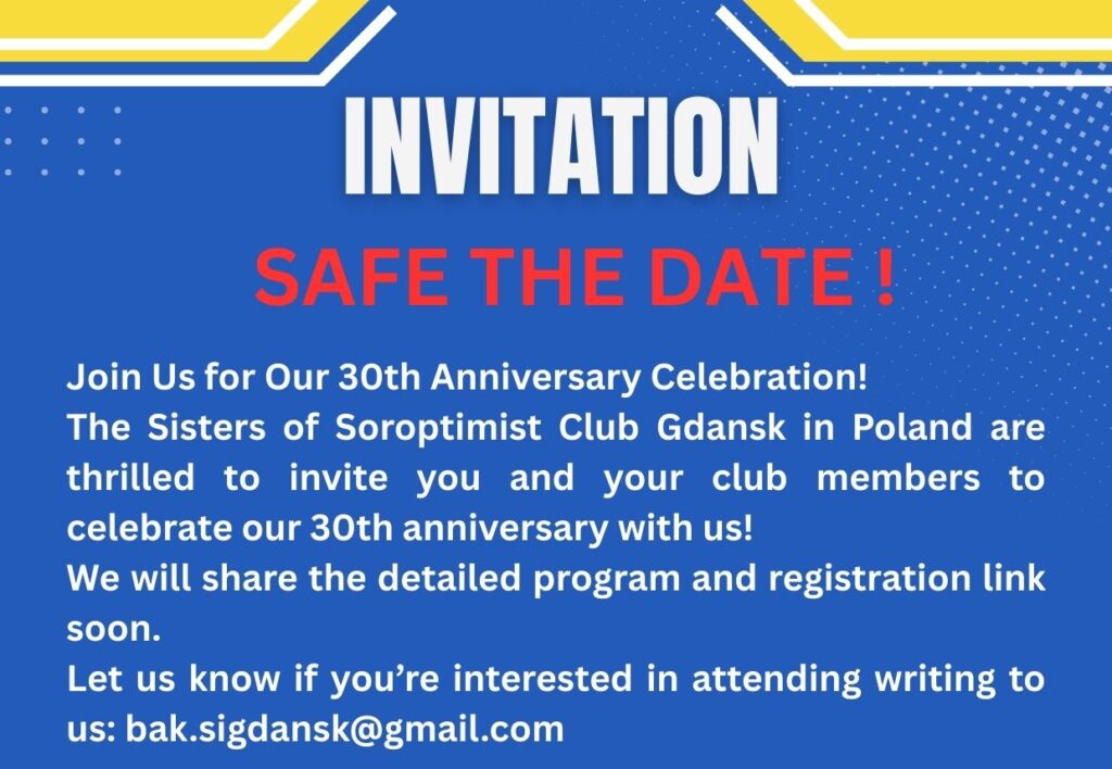 The Sisters of Soroptimist Club Gdańsk, Poland, are thrilled to invite you and your club members to celebrate our 30th anniversary with us!