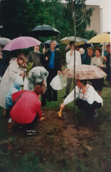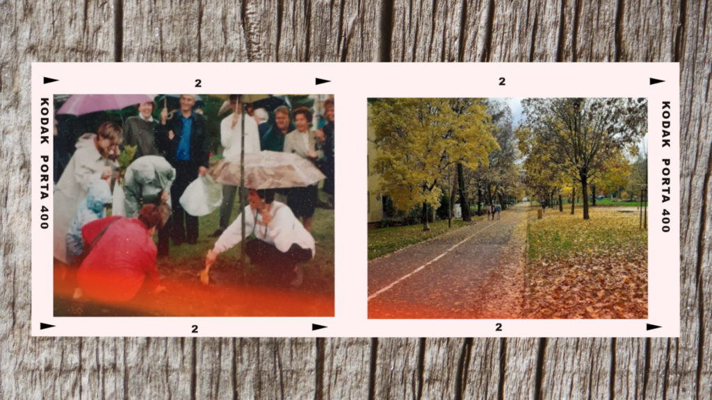 1993 – La présidente fondatrice Maria Holíková plante le premier arbre Planter un arbre, planter un espoir. | 2020 – La plupart des arbres sont là, même après presque trois décennies. |
