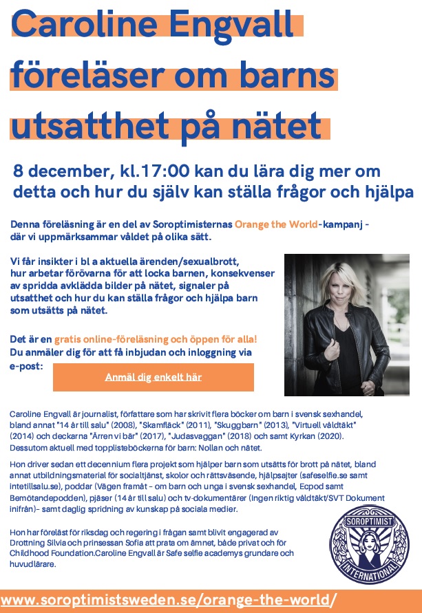 Comme chaque année, l’Union de Suède se mobilise pour la campagne « Oranger le monde ». La crise sanitaire demande toutefois plus de flexibilité et d’inventivité. C’est pourquoi l’Union offrira trois conférences en ligne les 26, 30 novembre et 8 décembre pour ses membres et pour tout public intéressé, afin de mobiliser et d’alerter le plus grand nombre sur la thématique de la violence faite aux femmes et aux filles.