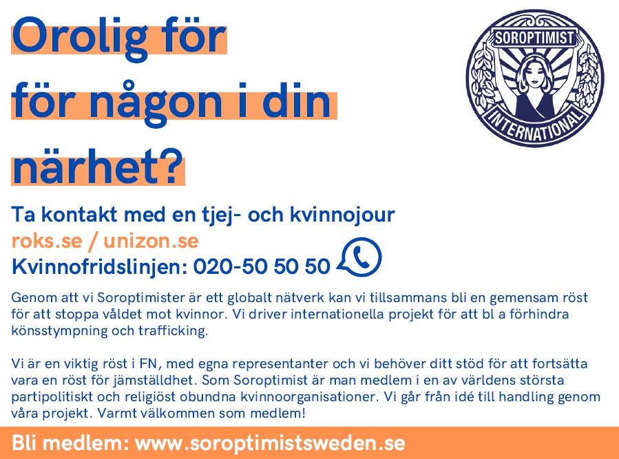 Pendant ces 16 jours d’activisme, les clubs soroptimist suédois ne seront pas en reste et proposeront des actions diverses et variées à travers tout le pays. Pour n’en citer que quelques-unes, le club de Gothenburg, en partenariat avec Zonta International et UN Women, délivrera des discours et des conférences publiques, distribuera des brochures informatives et vendra des pampilles oranges lumineuses. Les clubs d’Örebro-Wadköping, Landskrona et Falun organiseront quant à eux des marches et des manifestations colorées de parapluies oranges, pendant que le club de Sotenäs se lancera dans la confection de confitures et de vestes oranges ! Finalement, la tour d’eau d’Ystad se parera d’orange, tout comme de nombreux bâtiments publics à travers le pays.