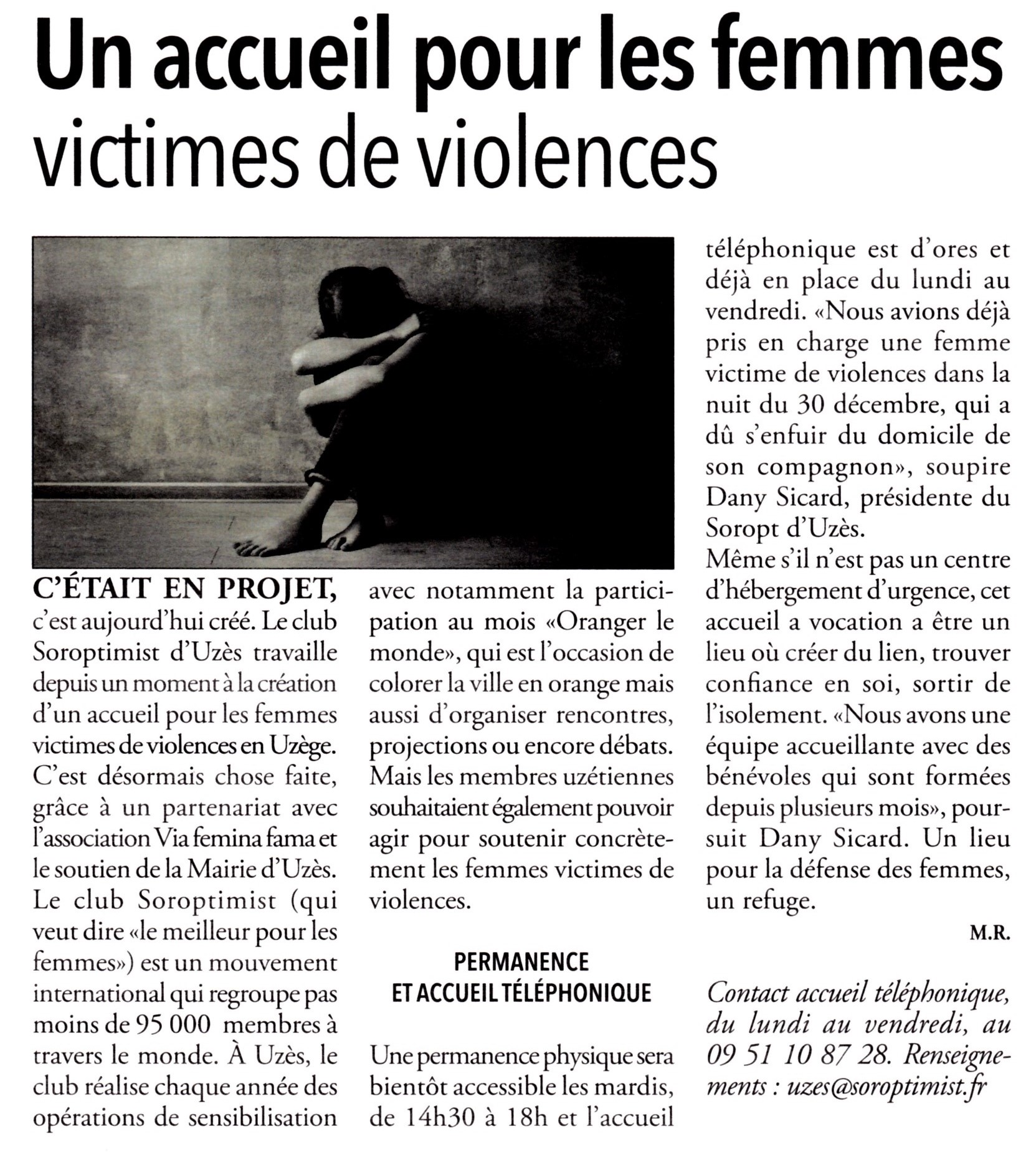 Les Soroptimist ont décidé de créer un bureau annexe à Uzès contre les violences faites aux femmes. Suite à leur intervention auprès de la mairie, les Soroptimist ont pu obtenir à leur disposition un local qu’elles ont aménagé en « permanence ».