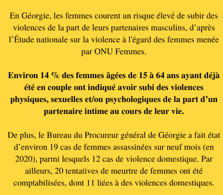Les mauvais traitements, le désespoir, la mort : de terribles réalités pour des milliers de femmes qui vivent en Géorgie et sont victimes de violences domestiques. Même quand elles cherchent de l’aide, cela n’est souvent pas suffisant. Il n’est pas rare que des survivantes retournent auprès de leur bourreau et soient à nouveau victimes.