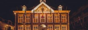 Les Soroptimist de l’Union Belge devant un un batimaent public illuminé en orange pour sensibiliser le public à la sévérité de la violence à l’égard des femmes.