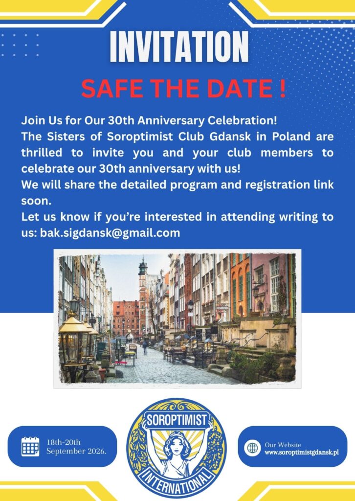 Les Sœurs du Soroptimist Club de Gdańsk, en Pologne, vous invitent, ainsi que les membres de votre club, à célébrer avec nous notre 30e anniversaire.