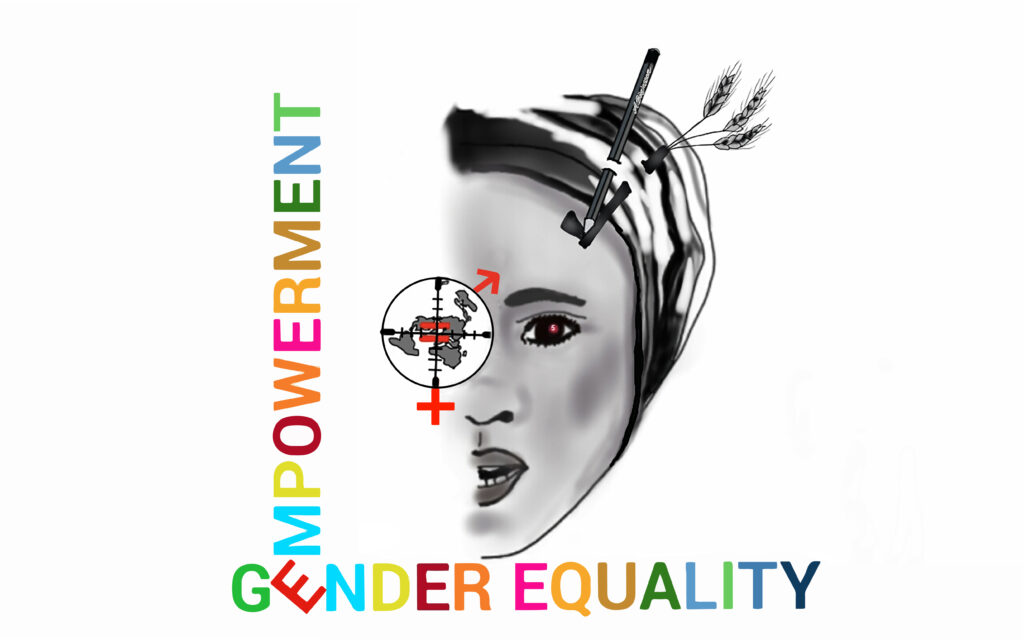 Une hache agricole sur la tête du sujet symbolise la situation de nombreuses femmes rurales. Le crayon à côté symbolise l’importance de l’éducation pour améliorer la vie des femmes.