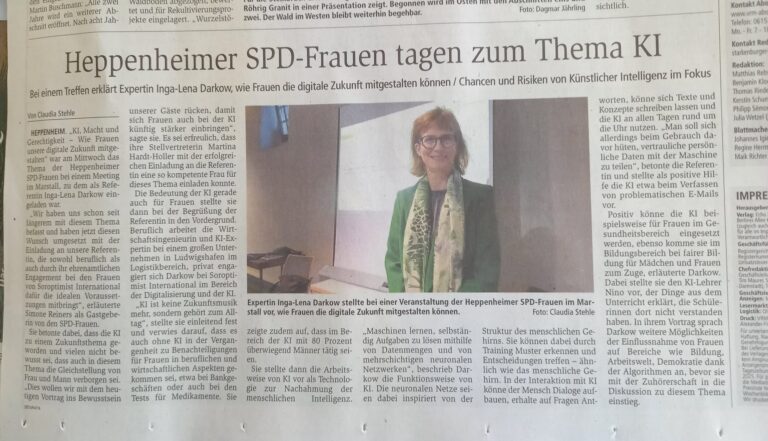 Les Soroptimist en Allemagne ont mis en œuvre l’initiative « Focus sur l’intelligence artificielle et la santé – Opportunités pour les femmes dans le monde numérique », dans le cadre de la campagne plus large « Intelligence artificielle (IA) et droits des femmes ». Le projet a touché environ 500 femmes à travers l’Allemagne et a placé l’éducation au cœur de l’autonomisation numérique.
