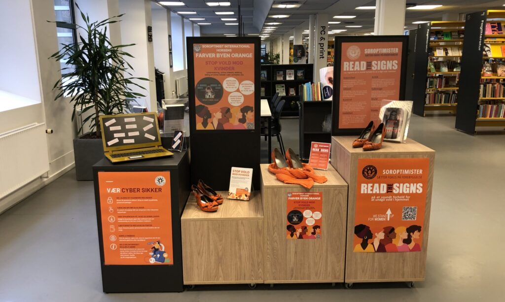 Au Danemark, le club SI Horsens a installé une exposition inspirante à la bibliothèque locale. Leur stand d’un orange éclatant – affiches, ballons et membres vêtues de la couleur emblématique – attirait immédiatement l’attention des passants et les invitait à découvrir des livres sur le sujet, accompagnés de symboliques escarpins orange.