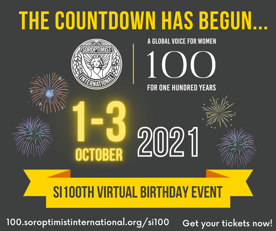 This October, Soroptimist International turns 100, and I would like to invite you all to a virtual global birthday celebration!  This year we have the once in a lifetime opportunity to join together to celebrate – reflecting on our Bright Past as a Global Voice for Women whilst looking and moving forward into our Brilliant Future. We think this is something worth celebrating.